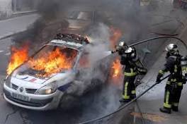French police protest 'anti-cop' violence, police car burned (AP Photo/Francois Mori). Firefighters work on a police car set up on fire by counter demonstrators while police forces gather to denounce the almost ...